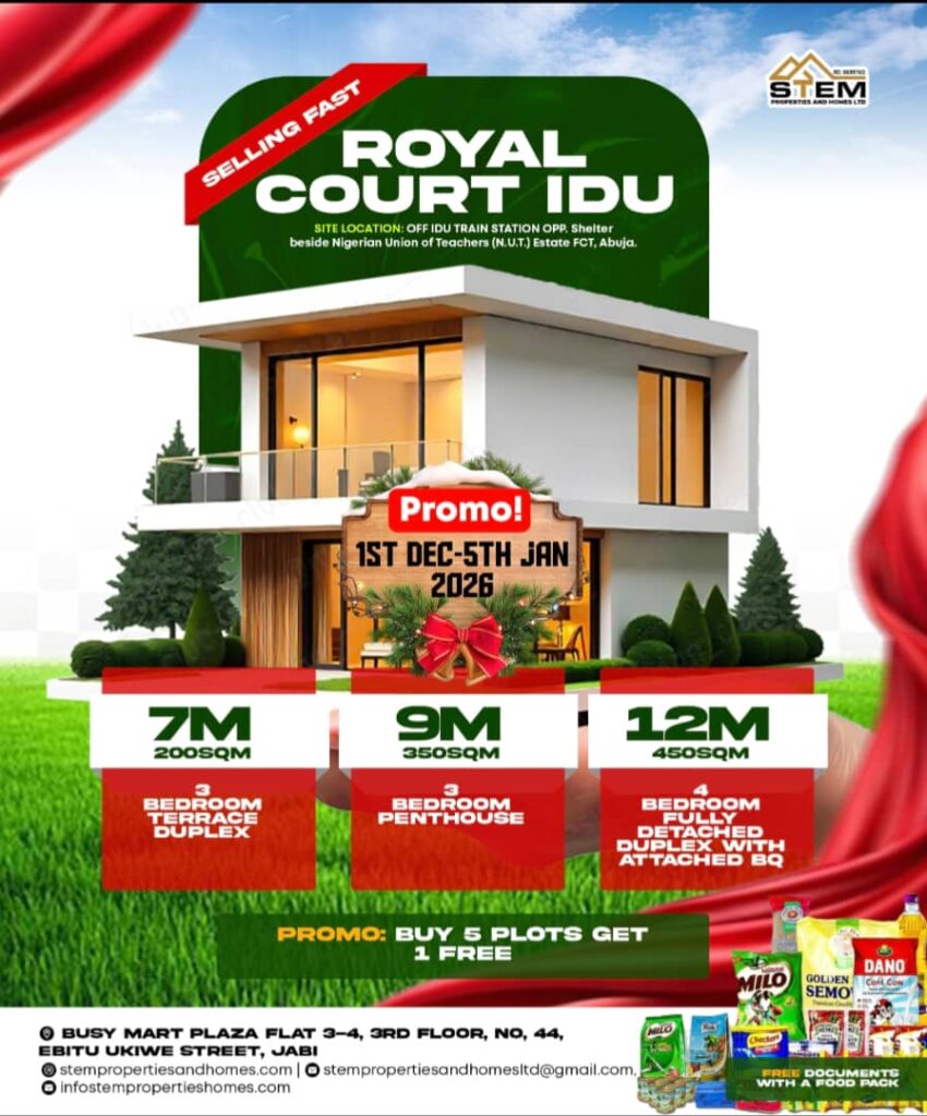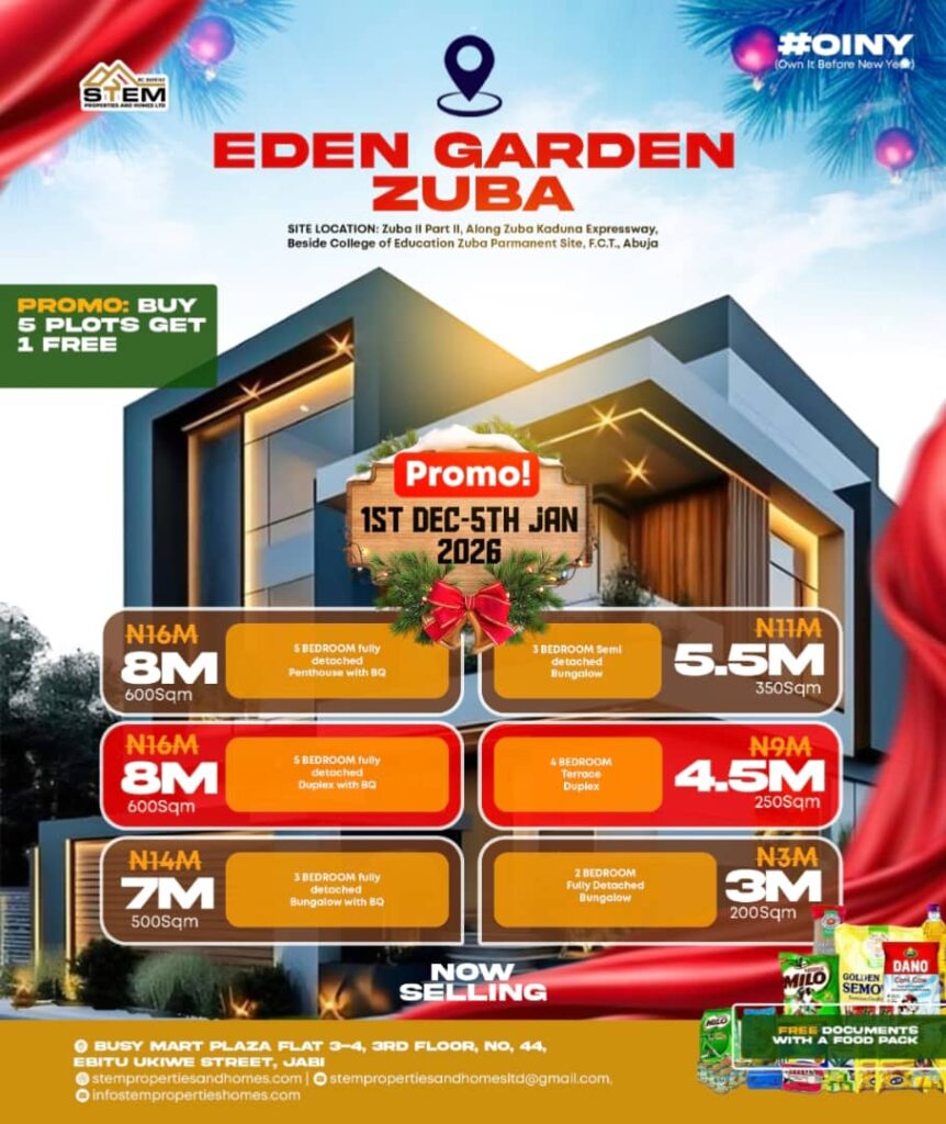 From December 1st to January 6th, enjoy special discounts, installment plans, bonuses, and a Buy 5 Plots Get 1 Free promo across all our estates in Abuja.